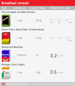Zuckerhaltige Getränke machen den größten Anteil der freien Zuckeraufnahme der Australier aus. Eine einzelne Dose oder 600 ml Flasche Erfrischungsgetränk kann die WHO-Empfehlung leicht überschreiten und etwa 40-70 g Zucker liefern. Ein Teelöffel entspricht 4,5 g Weißzucker, so dass Erfrischungsgetränke zwischen 8,5 und 15,5 Teelöffel reichen.