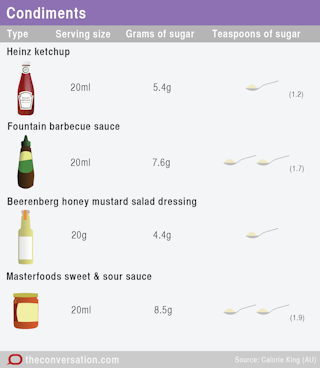 Eine Überraschung für viele ist der Zuckerzusatz in herzhaften Lebensmitteln wie Saucen und Gewürzen. Tomaten- und Barbecue-Sauce, Salatdressing und Sweet’n’sour Stirfry-Saucen enthalten ein bis zwei Teelöffel Zucker in jedem Esslöffel (20 ml).