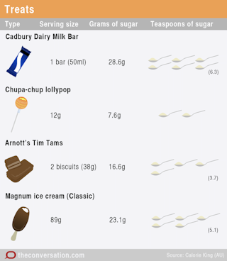 Wir wissen, dass Leckereien wie Schokolade, Gebäck und Eis Zucker enthalten, aber wie viel könnte Sie überraschen. Ein mit Schokolade überzogenes Eis enthält fünf Teelöffel Zucker oder fast die Hälfte des Tageslimits.