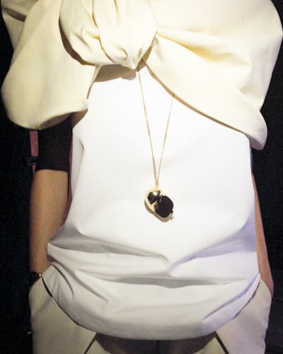 Escultural jóias de metal tem uma forma de leitura de tanto nervoso e polido, com os recentes iterações, tendo mais formas orgânicas. Para a Primavera / Verão de 2021, formas high-shine evoluíram em uma direção arredondada e suave — Balenciaga, Sportmax, Jil Sander, e JW Anderson estreou alguns dos melhores da temporada.